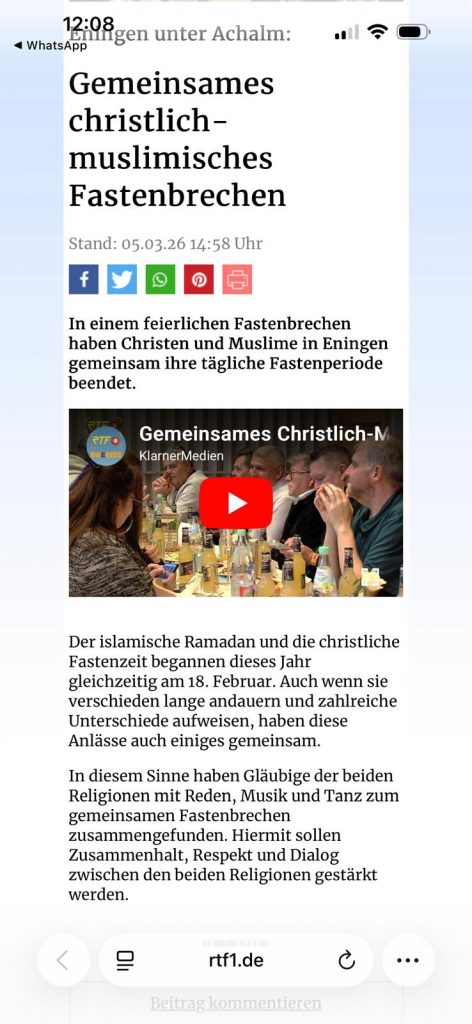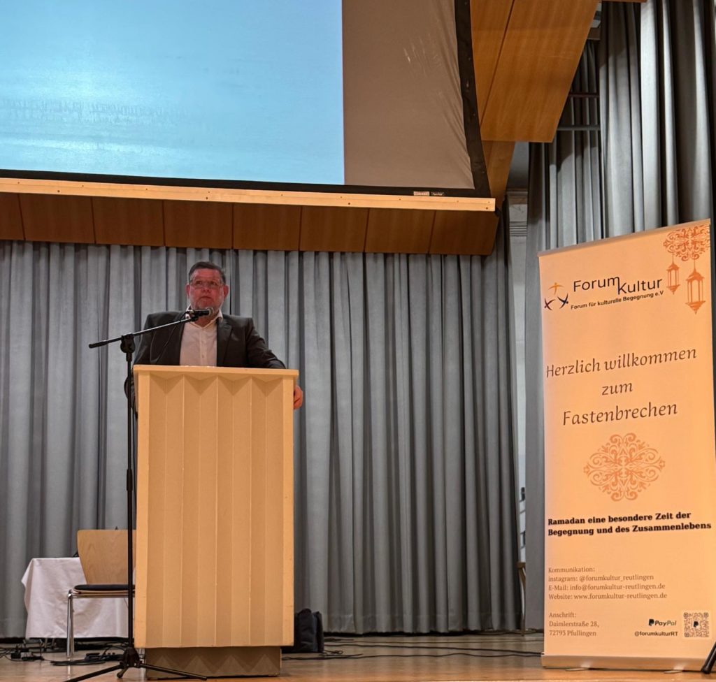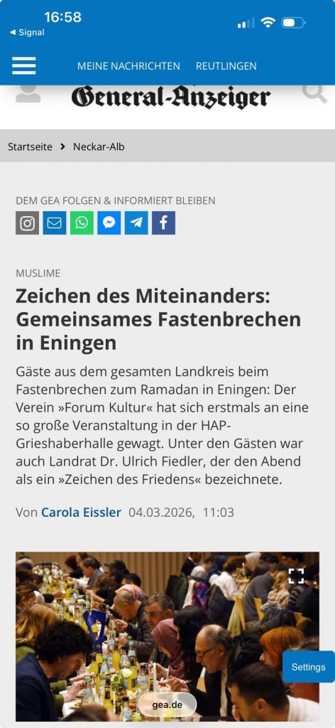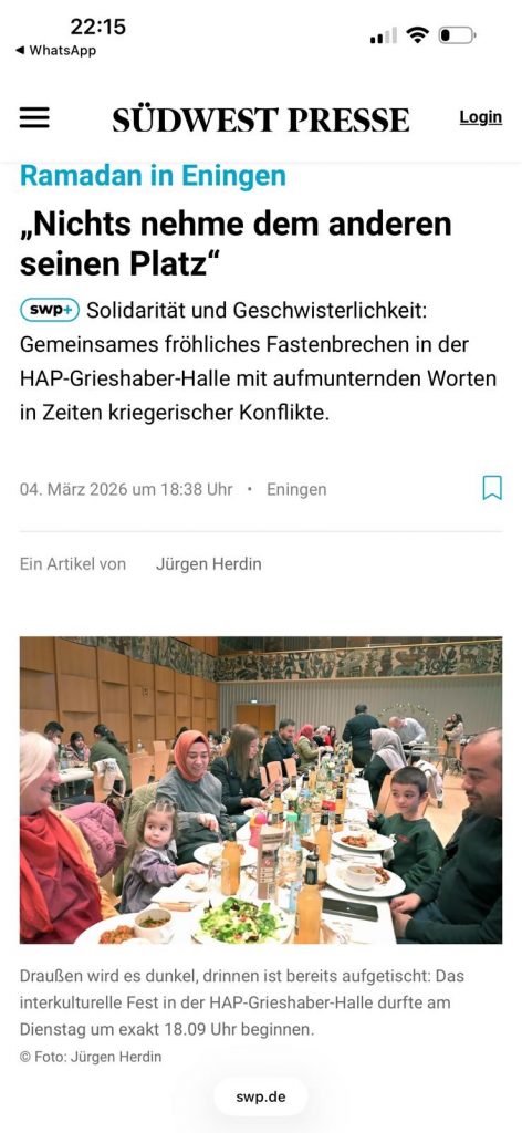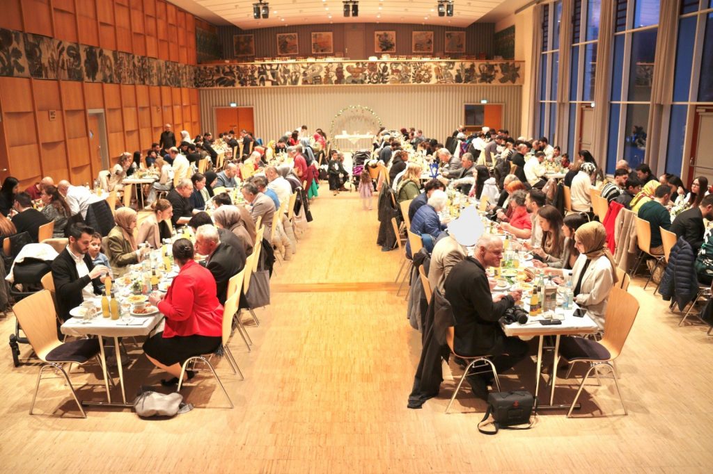 Das jährlich vom Forum für Kulturelle Begegnung e.V. organisierte traditionelle Iftar-Treffen fand in diesem Jahr mit einer besonders großen Beteiligung statt. Am 3. März 2026 kamen rund 240 Gäste unterschiedlicher religiöser, kultureller und gesellschaftlicher Hintergründe in der HAP-Halle in Eningen zusammen.